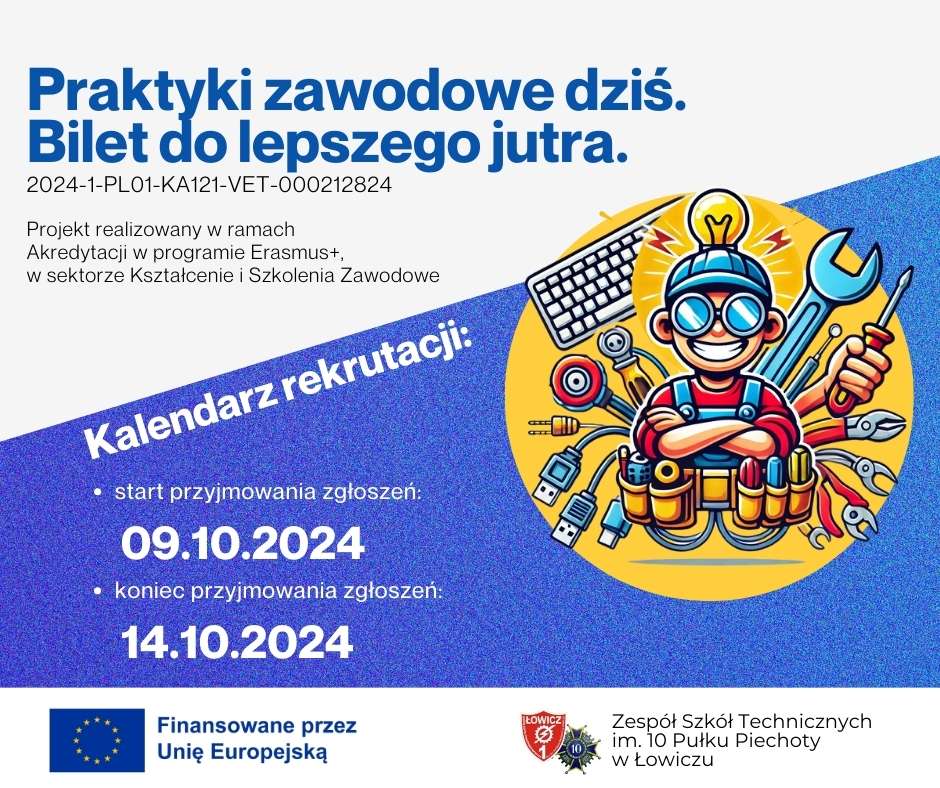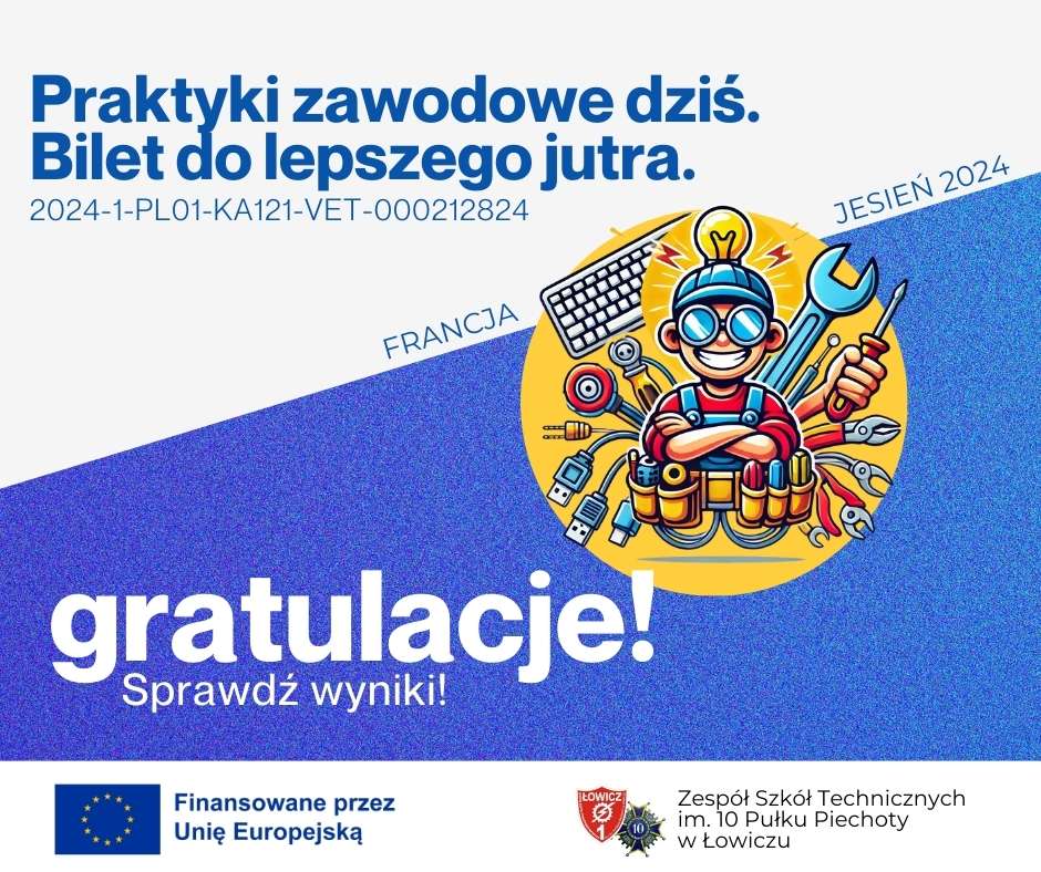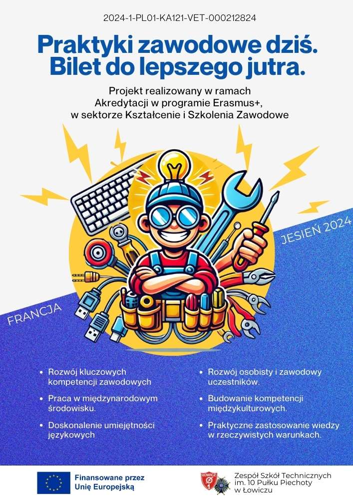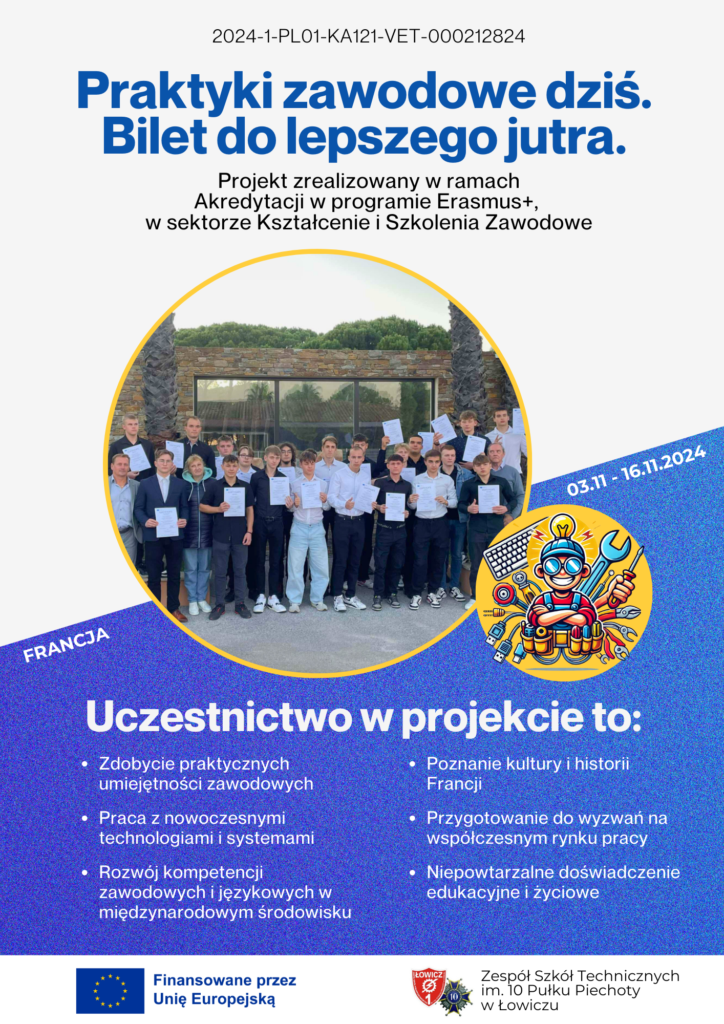 Zespół Szkół Technicznych im. 10 Pułku Piechoty w Łowiczu zakończył realizację projektu Erasmus+ o numerze: 2024-1-PL01-KA121-VET-000212824. W mobilności, która odbyła się we Francji, uczestniczyło 24 uczniów kształcących się w zawodach: technik elektryk, technik mechatronik oraz technik pojazdów samochodowych.